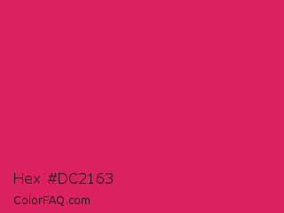 Hex #dc2163 Color is a normal rose color and the nearest color is Razzmatazz #e3256b. Hex code #dc2163 and RGB value is rgb(220,33,99). In RGB color space, this color is composed of 86% red, 13% green, 39% blue, In CMYK color space, this color is composed of 0% cyan, 85% magenta, 55% yellow , 14% black , In HSL color space, this color has a hue angle of 339° , 74% saturation and 50% lightness.