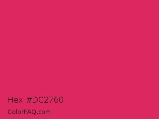Hex #dc2760 Color is a normal rose color and the nearest color is Cerise Red #de3163. Hex code #dc2760 and RGB value is rgb(220,39,96). In RGB color space, this color is composed of 86% red, 15% green, 38% blue, In CMYK color space, this color is composed of 0% cyan, 82% magenta, 56% yellow , 14% black , In HSL color space, this color has a hue angle of 341° , 72% saturation and 51% lightness.