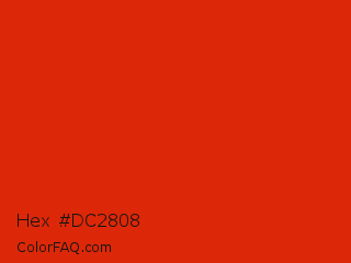 Hex #dc2808 Color is a normal red color and the nearest color is Maximum Red #d92121. Hex code #dc2808 and RGB value is rgb(220,40,8). In RGB color space, this color is composed of 86% red, 16% green, 3% blue, In CMYK color space, this color is composed of 0% cyan, 82% magenta, 96% yellow , 14% black , In HSL color space, this color has a hue angle of 9° , 93% saturation and 45% lightness.