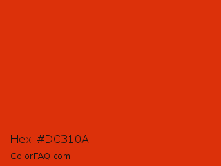 Hex #dc310a Color is a normal red color and the nearest color is Vermilion #d9381e. Hex code #dc310a and RGB value is rgb(220,49,10). In RGB color space, this color is composed of 86% red, 19% green, 4% blue, In CMYK color space, this color is composed of 0% cyan, 78% magenta, 95% yellow , 14% black , In HSL color space, this color has a hue angle of 11° , 91% saturation and 45% lightness.