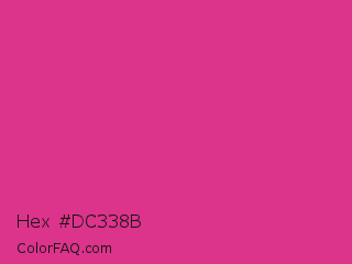 Hex #dc338b Color is a normal rose color and the nearest color is Cerise #da3287. Hex code #dc338b and RGB value is rgb(220,51,139). In RGB color space, this color is composed of 86% red, 20% green, 55% blue, In CMYK color space, this color is composed of 0% cyan, 77% magenta, 37% yellow , 14% black , In HSL color space, this color has a hue angle of 329° , 71% saturation and 53% lightness.