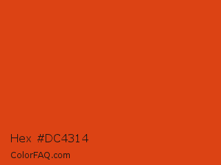Hex #dc4314 Color is a normal red color and the nearest color is Vermilion #d9381e. Hex code #dc4314 and RGB value is rgb(220,67,20). In RGB color space, this color is composed of 86% red, 26% green, 8% blue, In CMYK color space, this color is composed of 0% cyan, 70% magenta, 91% yellow , 14% black , In HSL color space, this color has a hue angle of 14° , 83% saturation and 47% lightness.