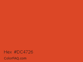 Hex #dc4726 Color is a normal red color and the nearest color is Punch #dc4333. Hex code #dc4726 and RGB value is rgb(220,71,38). In RGB color space, this color is composed of 86% red, 28% green, 15% blue, In CMYK color space, this color is composed of 0% cyan, 68% magenta, 83% yellow , 14% black , In HSL color space, this color has a hue angle of 11° , 72% saturation and 51% lightness.