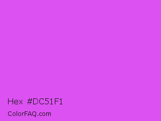 Hex #dc51f1 Color is a light magenta color and the nearest color is Heliotrope #df73ff. Hex code #dc51f1 and RGB value is rgb(220,81,241). In RGB color space, this color is composed of 86% red, 32% green, 95% blue, In CMYK color space, this color is composed of 9% cyan, 66% magenta, 0% yellow , 5% black , In HSL color space, this color has a hue angle of 292° , 85% saturation and 63% lightness.