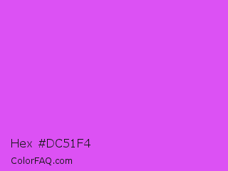 Hex #dc51f4 Color is a light purple color and the nearest color is Heliotrope #df73ff. Hex code #dc51f4 and RGB value is rgb(220,81,244). In RGB color space, this color is composed of 86% red, 32% green, 96% blue, In CMYK color space, this color is composed of 10% cyan, 67% magenta, 0% yellow , 4% black , In HSL color space, this color has a hue angle of 291° , 88% saturation and 64% lightness.