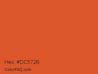 Hex #dc572b Color is a normal color and the nearest color is Flame #e25822. Hex code #dc572b and RGB value is rgb(220,87,43). In RGB color space, this color is composed of 86% red, 34% green, 17% blue, In CMYK color space, this color is composed of 0% cyan, 60% magenta, 80% yellow , 14% black , In HSL color space, this color has a hue angle of 15° , 72% saturation and 52% lightness.