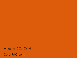 Hex #dc5c0b Color is a normal orange color and the nearest color is Bamboo #da6304. Hex code #dc5c0b and RGB value is rgb(220,92,11). In RGB color space, this color is composed of 86% red, 36% green, 4% blue, In CMYK color space, this color is composed of 0% cyan, 58% magenta, 95% yellow , 14% black , In HSL color space, this color has a hue angle of 23° , 90% saturation and 45% lightness.