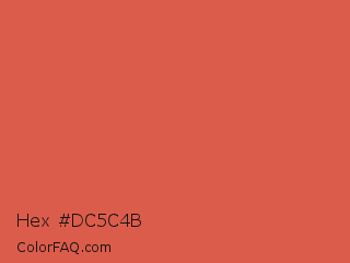 Hex #dc5c4b Color is a normal red color and the nearest color is Jelly Bean #da614e. Hex code #dc5c4b and RGB value is rgb(220,92,75). In RGB color space, this color is composed of 86% red, 36% green, 29% blue, In CMYK color space, this color is composed of 0% cyan, 58% magenta, 66% yellow , 14% black , In HSL color space, this color has a hue angle of 7° , 67% saturation and 58% lightness.