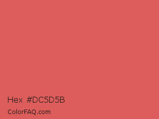 Hex #dc5d5b Color is a light red color and the nearest color is Roman #de6360. Hex code #dc5d5b and RGB value is rgb(220,93,91). In RGB color space, this color is composed of 86% red, 36% green, 36% blue, In CMYK color space, this color is composed of 0% cyan, 58% magenta, 59% yellow , 14% black , In HSL color space, this color has a hue angle of 1° , 65% saturation and 61% lightness.