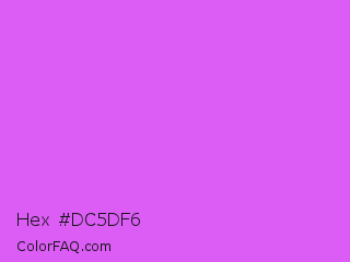 Hex #dc5df6 Color is a light purple color and the nearest color is Heliotrope #df73ff. Hex code #dc5df6 and RGB value is rgb(220,93,246). In RGB color space, this color is composed of 86% red, 36% green, 96% blue, In CMYK color space, this color is composed of 11% cyan, 62% magenta, 0% yellow , 4% black , In HSL color space, this color has a hue angle of 290° , 89% saturation and 66% lightness.
