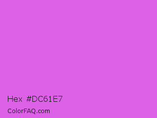 Hex #dc61e7 Color is a light magenta color and the nearest color is Orchid #da70d6. Hex code #dc61e7 and RGB value is rgb(220,97,231). In RGB color space, this color is composed of 86% red, 38% green, 91% blue, In CMYK color space, this color is composed of 5% cyan, 58% magenta, 0% yellow , 9% black , In HSL color space, this color has a hue angle of 295° , 74% saturation and 64% lightness.