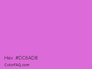 Hex #dc6ad8 Color is a light magenta color and the nearest color is Orchid #da70d6. Hex code #dc6ad8 and RGB value is rgb(220,106,216). In RGB color space, this color is composed of 86% red, 42% green, 85% blue, In CMYK color space, this color is composed of 0% cyan, 52% magenta, 2% yellow , 14% black , In HSL color space, this color has a hue angle of 302° , 62% saturation and 64% lightness.