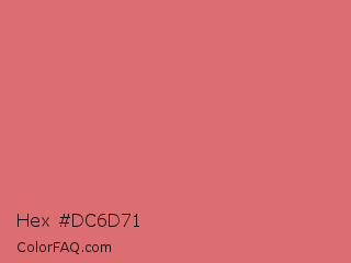 Hex #dc6d71 Color is a light red color and the nearest color is Light Carmine Pink #e66771. Hex code #dc6d71 and RGB value is rgb(220,109,113). In RGB color space, this color is composed of 86% red, 43% green, 44% blue, In CMYK color space, this color is composed of 0% cyan, 50% magenta, 49% yellow , 14% black , In HSL color space, this color has a hue angle of 358° , 61% saturation and 65% lightness.
