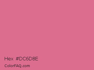 Hex #dc6d8e Color is a light rose color and the nearest color is Pale Red Violet #db7093. Hex code #dc6d8e and RGB value is rgb(220,109,142). In RGB color space, this color is composed of 86% red, 43% green, 56% blue, In CMYK color space, this color is composed of 0% cyan, 50% magenta, 35% yellow , 14% black , In HSL color space, this color has a hue angle of 342° , 61% saturation and 65% lightness.
