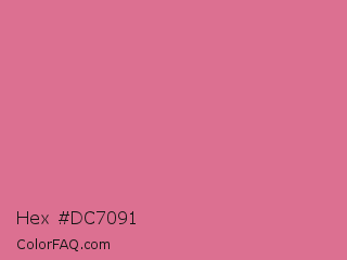 Hex #dc7091 Color is a light rose color and the nearest color is Pale Red Violet #db7093. Hex code #dc7091 and RGB value is rgb(220,112,145). In RGB color space, this color is composed of 86% red, 44% green, 57% blue, In CMYK color space, this color is composed of 0% cyan, 49% magenta, 34% yellow , 14% black , In HSL color space, this color has a hue angle of 342° , 61% saturation and 65% lightness.