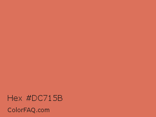 Hex #dc715b Color is a light red color and the nearest color is Terracotta #e2725b. Hex code #dc715b and RGB value is rgb(220,113,91). In RGB color space, this color is composed of 86% red, 44% green, 36% blue, In CMYK color space, this color is composed of 0% cyan, 49% magenta, 59% yellow , 14% black , In HSL color space, this color has a hue angle of 10° , 65% saturation and 61% lightness.