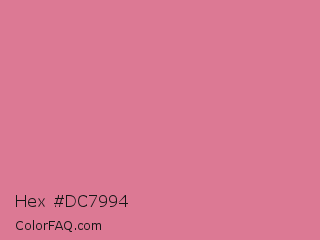 Hex #dc7994 Color is a light rose color and the nearest color is Pale Red Violet #db7093. Hex code #dc7994 and RGB value is rgb(220,121,148). In RGB color space, this color is composed of 86% red, 47% green, 58% blue, In CMYK color space, this color is composed of 0% cyan, 45% magenta, 33% yellow , 14% black , In HSL color space, this color has a hue angle of 344° , 59% saturation and 67% lightness.