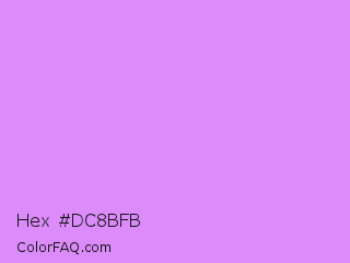Hex #dc8bfb Color is a light purple color and the nearest color is Bright Lilac #d891ef. Hex code #dc8bfb and RGB value is rgb(220,139,251). In RGB color space, this color is composed of 86% red, 55% green, 98% blue, In CMYK color space, this color is composed of 12% cyan, 45% magenta, 0% yellow , 2% black , In HSL color space, this color has a hue angle of 283° , 93% saturation and 76% lightness.
