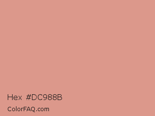 Hex #dc988b Color is a light red color and the nearest color is Petite Orchid #db9690. Hex code #dc988b and RGB value is rgb(220,152,139). In RGB color space, this color is composed of 86% red, 60% green, 55% blue, In CMYK color space, this color is composed of 0% cyan, 31% magenta, 37% yellow , 14% black , In HSL color space, this color has a hue angle of 10° , 54% saturation and 70% lightness.