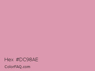 Hex #dc98ae Color is a light rose color and the nearest color is Careys Pink #d29eaa. Hex code #dc98ae and RGB value is rgb(220,152,174). In RGB color space, this color is composed of 86% red, 60% green, 68% blue, In CMYK color space, this color is composed of 0% cyan, 31% magenta, 21% yellow , 14% black , In HSL color space, this color has a hue angle of 341° , 49% saturation and 73% lightness.
