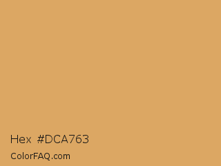 Hex #dca763 Color is a light orange color and the nearest color is Earth Yellow #e1a95f. Hex code #dca763 and RGB value is rgb(220,167,99). In RGB color space, this color is composed of 86% red, 65% green, 39% blue, In CMYK color space, this color is composed of 0% cyan, 24% magenta, 55% yellow , 14% black , In HSL color space, this color has a hue angle of 34° , 63% saturation and 63% lightness.