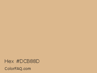 Hex #dcb88d Color is a light orange color and the nearest color is Burlywood #deb887. Hex code #dcb88d and RGB value is rgb(220,184,141). In RGB color space, this color is composed of 86% red, 72% green, 55% blue, In CMYK color space, this color is composed of 0% cyan, 16% magenta, 36% yellow , 14% black , In HSL color space, this color has a hue angle of 33° , 53% saturation and 71% lightness.