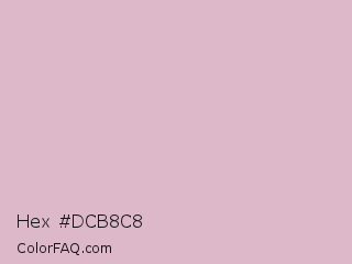 Hex #dcb8c8 Color is a light rose color and the nearest color is Pink Flare #e1c0c8. Hex code #dcb8c8 and RGB value is rgb(220,184,200). In RGB color space, this color is composed of 86% red, 72% green, 78% blue, In CMYK color space, this color is composed of 0% cyan, 16% magenta, 9% yellow , 14% black , In HSL color space, this color has a hue angle of 333° , 34% saturation and 79% lightness.
