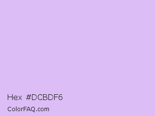 Hex #dcbdf6 Color is a very light purple color and the nearest color is Perfume #d0bef8. Hex code #dcbdf6 and RGB value is rgb(220,189,246). In RGB color space, this color is composed of 86% red, 74% green, 96% blue, In CMYK color space, this color is composed of 11% cyan, 23% magenta, 0% yellow , 4% black , In HSL color space, this color has a hue angle of 273° , 76% saturation and 85% lightness.