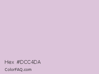 Hex #dcc4da Color is a very light magenta color and the nearest color is Maverick #d8c2d5. Hex code #dcc4da and RGB value is rgb(220,196,218). In RGB color space, this color is composed of 86% red, 77% green, 85% blue, In CMYK color space, this color is composed of 0% cyan, 11% magenta, 1% yellow , 14% black , In HSL color space, this color has a hue angle of 305° , 26% saturation and 82% lightness.