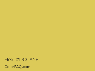 Hex #dcca58 Color is a normal yellow color and the nearest color is Tacha #d6c562. Hex code #dcca58 and RGB value is rgb(220,202,88). In RGB color space, this color is composed of 86% red, 79% green, 35% blue, In CMYK color space, this color is composed of 0% cyan, 8% magenta, 60% yellow , 14% black , In HSL color space, this color has a hue angle of 52° , 65% saturation and 60% lightness.