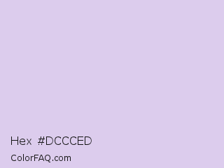 Hex #dccced Color is a very light violet color and the nearest color is Moon Raker #d6cef6. Hex code #dccced and RGB value is rgb(220,204,237). In RGB color space, this color is composed of 86% red, 80% green, 93% blue, In CMYK color space, this color is composed of 7% cyan, 14% magenta, 0% yellow , 7% black , In HSL color space, this color has a hue angle of 269° , 48% saturation and 86% lightness.