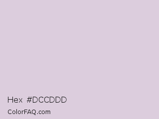 Hex #dccddd Color is a very light magenta color and the nearest color is Lola #dfcfdb. Hex code #dccddd and RGB value is rgb(220,205,221). In RGB color space, this color is composed of 86% red, 80% green, 87% blue, In CMYK color space, this color is composed of 0% cyan, 7% magenta, 0% yellow , 13% black , In HSL color space, this color has a hue angle of 296° , 19% saturation and 84% lightness.