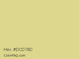Hex #dcd78d Color is a light yellow color and the nearest color is Winter Hazel #d5d195. Hex code #dcd78d and RGB value is rgb(220,215,141). In RGB color space, this color is composed of 86% red, 84% green, 55% blue, In CMYK color space, this color is composed of 0% cyan, 2% magenta, 36% yellow , 14% black , In HSL color space, this color has a hue angle of 56° , 53% saturation and 71% lightness.