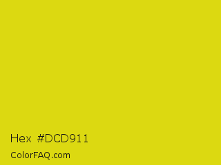 Hex #dcd911 Color is a normal yellow color and the nearest color is Barberry #ded717. Hex code #dcd911 and RGB value is rgb(220,217,17). In RGB color space, this color is composed of 86% red, 85% green, 7% blue, In CMYK color space, this color is composed of 0% cyan, 1% magenta, 92% yellow , 14% black , In HSL color space, this color has a hue angle of 59° , 86% saturation and 46% lightness.