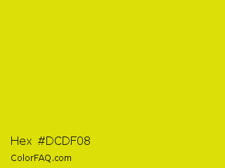 Hex #dcdf08 Color is a normal yellow color and the nearest color is Peridot #e6e200. Hex code #dcdf08 and RGB value is rgb(220,223,8). In RGB color space, this color is composed of 86% red, 87% green, 3% blue, In CMYK color space, this color is composed of 1% cyan, 0% magenta, 96% yellow , 13% black , In HSL color space, this color has a hue angle of 61° , 93% saturation and 45% lightness.