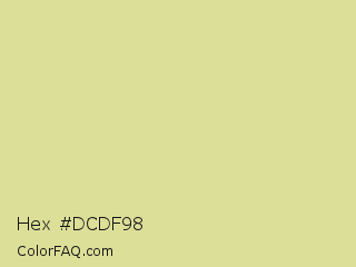 Hex #dcdf98 Color is a light yellow color and the nearest color is Deco #d2da97. Hex code #dcdf98 and RGB value is rgb(220,223,152). In RGB color space, this color is composed of 86% red, 87% green, 60% blue, In CMYK color space, this color is composed of 1% cyan, 0% magenta, 32% yellow , 13% black , In HSL color space, this color has a hue angle of 63° , 53% saturation and 74% lightness.