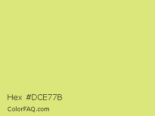 Hex #dce77b Color is a light yellow color and the nearest color is Booger Buster #dde26a. Hex code #dce77b and RGB value is rgb(220,231,123). In RGB color space, this color is composed of 86% red, 91% green, 48% blue, In CMYK color space, this color is composed of 5% cyan, 0% magenta, 47% yellow , 9% black , In HSL color space, this color has a hue angle of 66° , 69% saturation and 69% lightness.