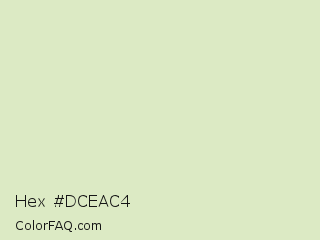 Hex #dceac4 Color is a very light green color and the nearest color is Beryl Green #dee5c0. Hex code #dceac4 and RGB value is rgb(220,234,196). In RGB color space, this color is composed of 86% red, 92% green, 77% blue, In CMYK color space, this color is composed of 6% cyan, 0% magenta, 16% yellow , 8% black , In HSL color space, this color has a hue angle of 82° , 48% saturation and 84% lightness.