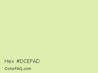 Hex #dcefad Color is a very light lime color and the nearest color is Caper #dcedb4. Hex code #dcefad and RGB value is rgb(220,239,173). In RGB color space, this color is composed of 86% red, 94% green, 68% blue, In CMYK color space, this color is composed of 8% cyan, 0% magenta, 28% yellow , 6% black , In HSL color space, this color has a hue angle of 77° , 67% saturation and 81% lightness.