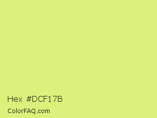 Hex #dcf17b Color is a light lime color and the nearest color is Mindaro #e3f988. Hex code #dcf17b and RGB value is rgb(220,241,123). In RGB color space, this color is composed of 86% red, 95% green, 48% blue, In CMYK color space, this color is composed of 9% cyan, 0% magenta, 49% yellow , 5% black , In HSL color space, this color has a hue angle of 71° , 81% saturation and 71% lightness.