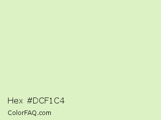 Hex #dcf1c4 Color is a very light green color and the nearest color is Tea Green #d0f0c0. Hex code #dcf1c4 and RGB value is rgb(220,241,196). In RGB color space, this color is composed of 86% red, 95% green, 77% blue, In CMYK color space, this color is composed of 9% cyan, 0% magenta, 19% yellow , 5% black , In HSL color space, this color has a hue angle of 88° , 62% saturation and 86% lightness.