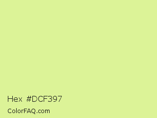 Hex #dcf397 Color is a light lime color and the nearest color is Key Lime #e8f48c. Hex code #dcf397 and RGB value is rgb(220,243,151). In RGB color space, this color is composed of 86% red, 95% green, 59% blue, In CMYK color space, this color is composed of 9% cyan, 0% magenta, 38% yellow , 5% black , In HSL color space, this color has a hue angle of 75° , 79% saturation and 77% lightness.