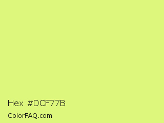 Hex #dcf77b Color is a light lime color and the nearest color is Mindaro #e3f988. Hex code #dcf77b and RGB value is rgb(220,247,123). In RGB color space, this color is composed of 86% red, 97% green, 48% blue, In CMYK color space, this color is composed of 11% cyan, 0% magenta, 50% yellow , 3% black , In HSL color space, this color has a hue angle of 73° , 89% saturation and 73% lightness.