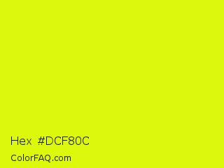 Hex #dcf80c Color is a normal yellow color and the nearest color is Chartreuse Yellow #dfff00. Hex code #dcf80c and RGB value is rgb(220,248,12). In RGB color space, this color is composed of 86% red, 97% green, 5% blue, In CMYK color space, this color is composed of 11% cyan, 0% magenta, 95% yellow , 3% black , In HSL color space, this color has a hue angle of 67° , 94% saturation and 51% lightness.