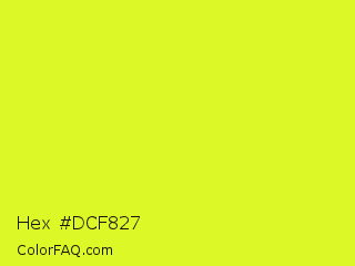 Hex #dcf827 Color is a normal yellow color and the nearest color is Arctic Lime #d0ff14. Hex code #dcf827 and RGB value is rgb(220,248,39). In RGB color space, this color is composed of 86% red, 97% green, 15% blue, In CMYK color space, this color is composed of 11% cyan, 0% magenta, 84% yellow , 3% black , In HSL color space, this color has a hue angle of 68° , 94% saturation and 56% lightness.