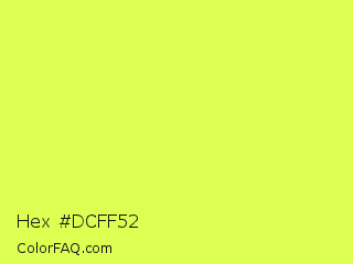 Hex #dcff52 Color is a light lime color and the nearest color is Starship #ecf245. Hex code #dcff52 and RGB value is rgb(220,255,82). In RGB color space, this color is composed of 86% red, 100% green, 32% blue, In CMYK color space, this color is composed of 14% cyan, 0% magenta, 68% yellow , 0% black , In HSL color space, this color has a hue angle of 72° , 100% saturation and 66% lightness.