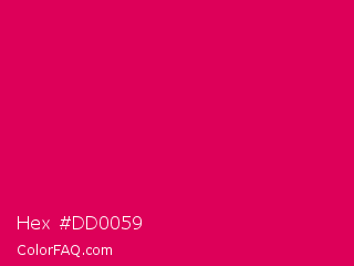 Hex #dd0059 Color is a normal rose color and the nearest color is Rubine Red #d10056. Hex code #dd0059 and RGB value is rgb(221,0,89). In RGB color space, this color is composed of 87% red, 0% green, 35% blue, In CMYK color space, this color is composed of 0% cyan, 100% magenta, 60% yellow , 13% black , In HSL color space, this color has a hue angle of 336° , 100% saturation and 43% lightness.