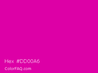 Hex #dd00a6 Color is a normal magenta color and the nearest color is Hollywood Cerise #f400a1. Hex code #dd00a6 and RGB value is rgb(221,0,166). In RGB color space, this color is composed of 87% red, 0% green, 65% blue, In CMYK color space, this color is composed of 0% cyan, 100% magenta, 25% yellow , 13% black , In HSL color space, this color has a hue angle of 315° , 100% saturation and 43% lightness.
