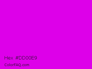 Hex #dd00e9 Color is a normal magenta color and the nearest color is Phlox #df00ff. Hex code #dd00e9 and RGB value is rgb(221,0,233). In RGB color space, this color is composed of 87% red, 0% green, 91% blue, In CMYK color space, this color is composed of 5% cyan, 100% magenta, 0% yellow , 9% black , In HSL color space, this color has a hue angle of 297° , 100% saturation and 46% lightness.
