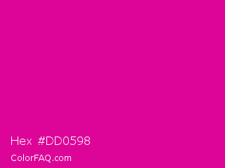 Hex #dd0598 Color is a normal magenta color and the nearest color is Hollywood Cerise #f400a1. Hex code #dd0598 and RGB value is rgb(221,5,152). In RGB color space, this color is composed of 87% red, 2% green, 60% blue, In CMYK color space, this color is composed of 0% cyan, 98% magenta, 31% yellow , 13% black , In HSL color space, this color has a hue angle of 319° , 96% saturation and 44% lightness.